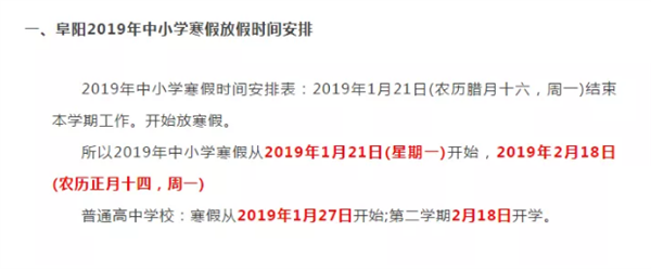 文中写道:阜阳2019年中小学寒假放假时间从2019年1月21日(星期一)开始,2019年2月18日(农历正月十四,周一)