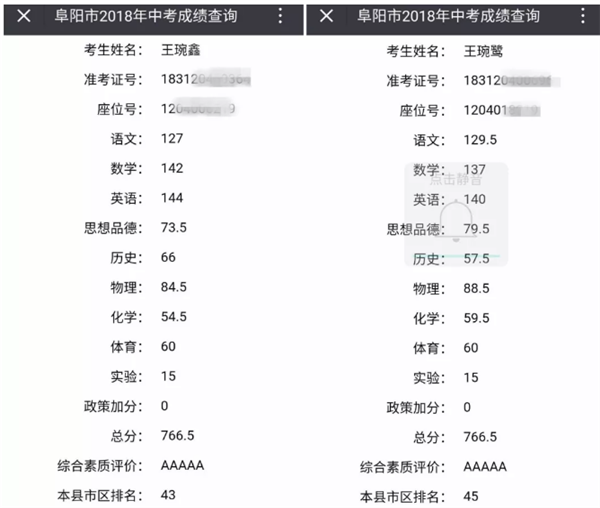 阜阳一对双胞胎姐妹中考考出相同分数难道双胞胎真的有心 灵 感 应 ?虽然两姐妹各科成绩略有不同但是总分都是766.5综合素质评价都是AAAAA王琬鑫来自九2班,王琬鹭来自九8班,只有数学、政治、体育三